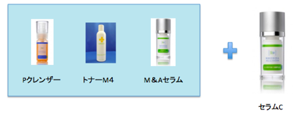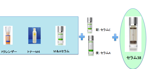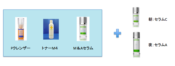 朝1回、夜2回、Pクレンザーで洗顔します。トナーM4は朝と夜。M&Aセラムは朝夜2回、またはどちらかの1回。
