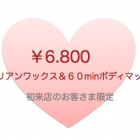 続きを読む秋のキャンペーンのお知らせです。 こちらは初めてビューティサイエンス・デイスパにご来店のお客さまキャンペーンになります。 ブラジリアンワックス+60min ボディマッサージ ¥6.800 ビューティサイエンス・デイスパの初回ブラジリアンワックスは¥6.800 ですので、こちらは60minのボディマッサージが無料ということになります。♪ 日時限定ですので、自動 …